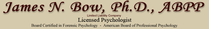 Dr. James Bow's current practice is limited to forensic training and consultation. He provides consultation to attorneys, courts, and licensing boards regarding work product reviews. He also assists attorneys in preparing for cross-examining expert witnesses. Dr. Bow no longer conducts evaluations for the court or any other type of evaluations or treatment.
